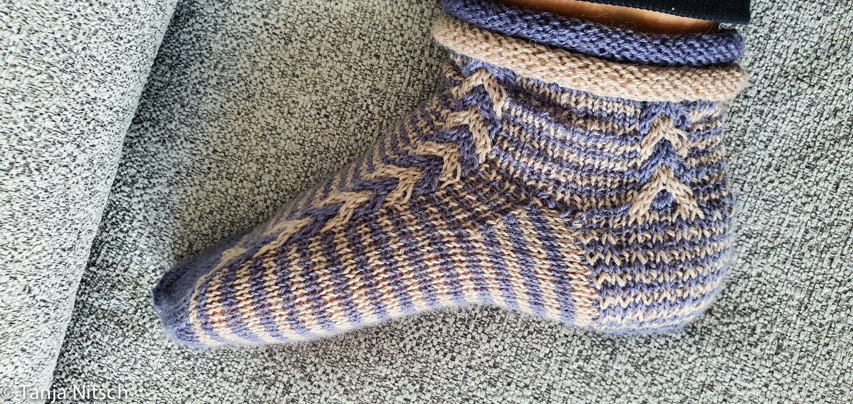 Die Shadow-Wrap Ferse wird nicht beschrieben, sondern nur auf das Video verwiesen. Aber jede andere Ferse ist auch machbar.