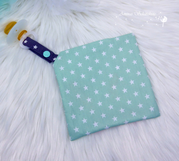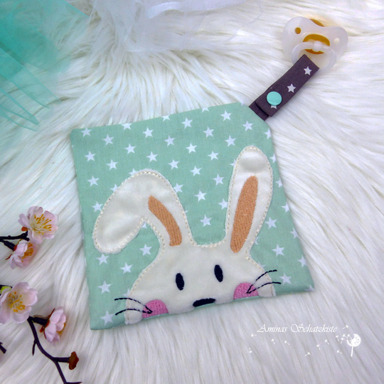 Das Schmusetuch wird komplett im Stickrahmen in the Hoop gestickt. Lediglich die kleine Wendeöffnung wird dann per Hand oder mit der Nähmaschine verschlossen. An dem Bändchen kann ein Schnuller angebracht werden.