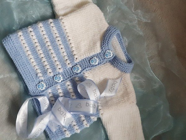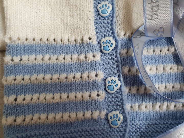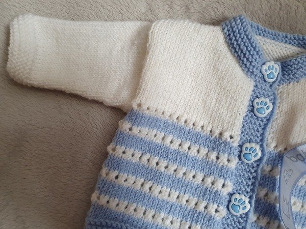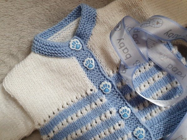 Über dieses niedliche, kuschelige Babyjäckchen in Blau und Weiß freut sich sicherlich jede Mama. Damit ist ihr kleiner Prinz doch perfekt angezogen für die nächste Ausfahrt oder zum Fotografen.