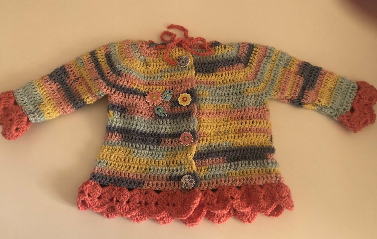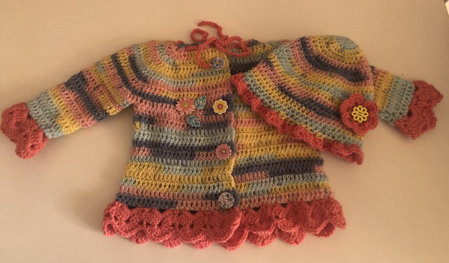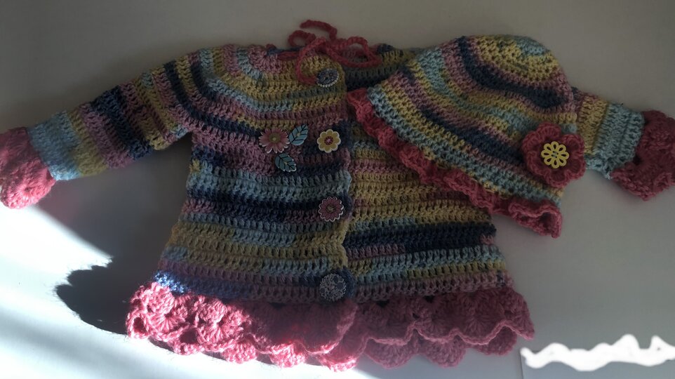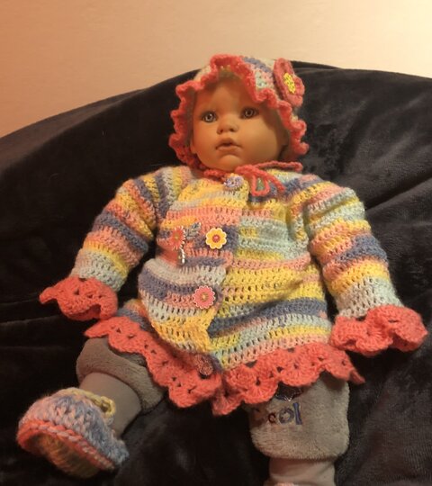 Bei diesem süßen Babyset erhalten Sie 3 Anleitungen - Jacke , Mütze und Schuhe.