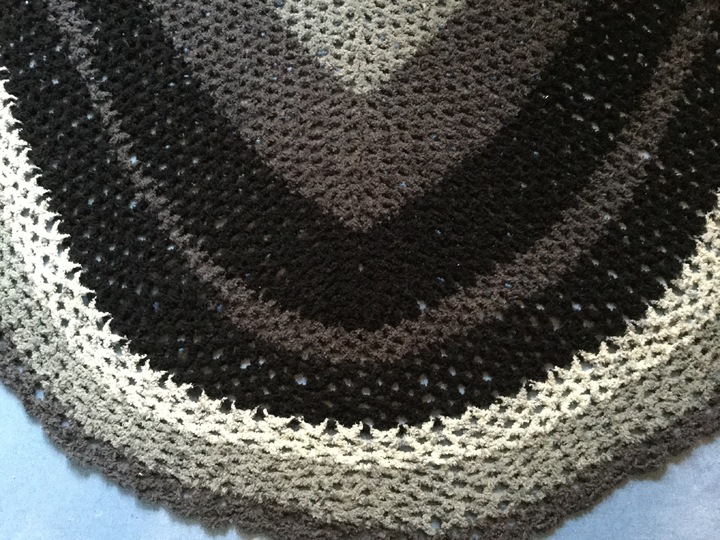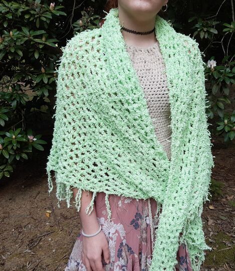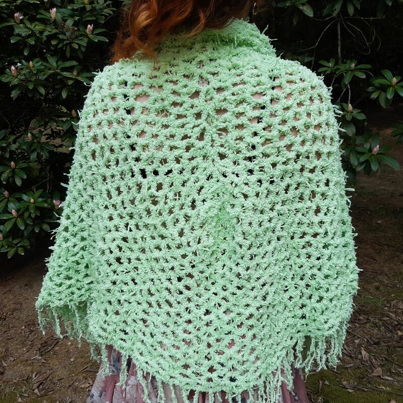 Das flauschige Garn ist etwas schwierig zu häkeln, da man die Maschen kaum erkennen kann. Daher bietet sich ein lockeres Netz-Muster aus Luftmaschen und Stäbchen an. Das sieht gut aus und ist schnell gehäkelt.