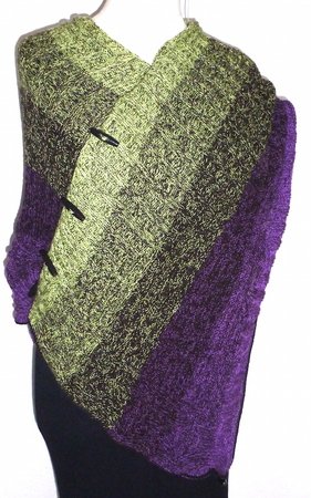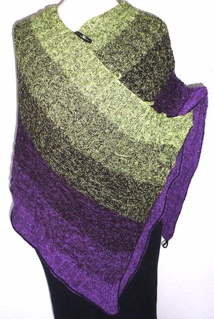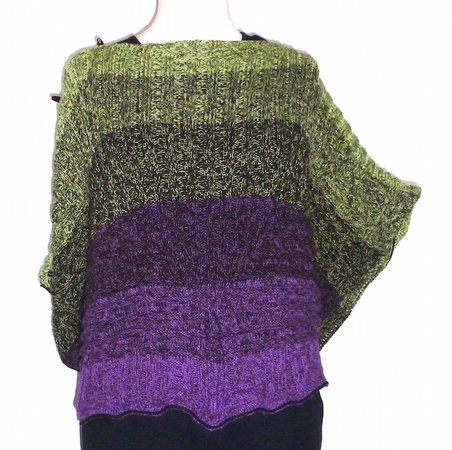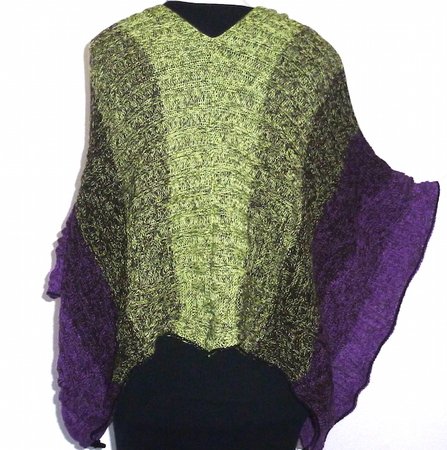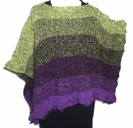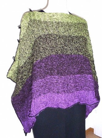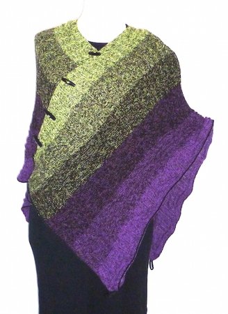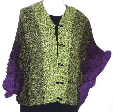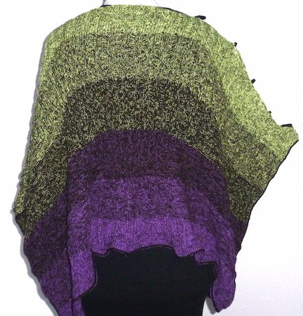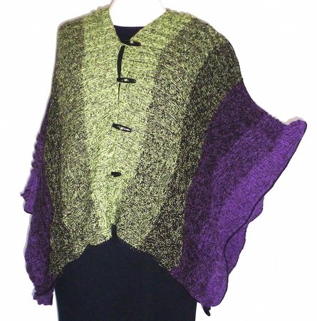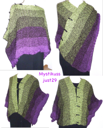 Der Mystikuss ist ein Poncho, der sich auf verschiedenste Weise tragen lässt, jeweils wahlweise locker den Körper umspielend oder hinten um die Taille geknöpft und damit eng anliegend.