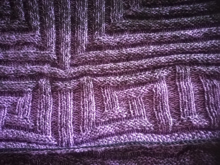 Das Muster besteht aus Längs- und Querrippen – und einem Mäandermuster rundum. Dadurch springt das Strickstück etwas zusammen, wärmt gut und gibt dem Poncho je nach Trageweise seine Form.