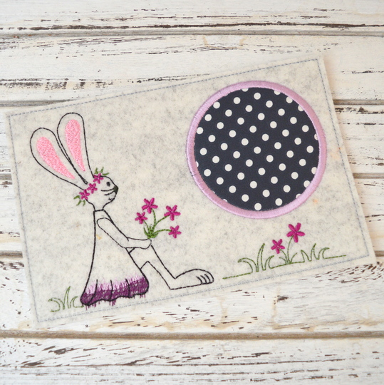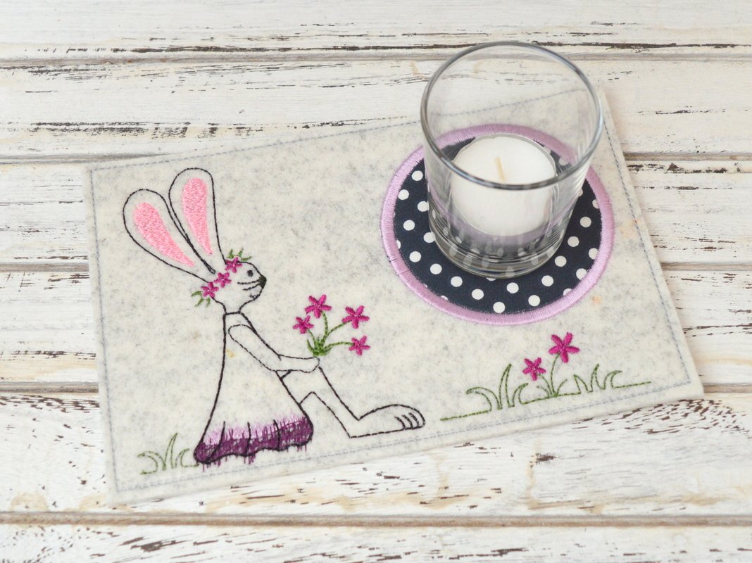 Untersetzer für eine Kaffeetasse oder Kerzenglas, süßer Tassenteppich mit einer sitzenden, Blumen pflückender Hasendame, kleines Geschenk, schnell gestickt, in der Größe 13x18cm und 13x20cm gespeichert. (ohne Wendeöffnung, geeignet für Filz,ect....)