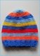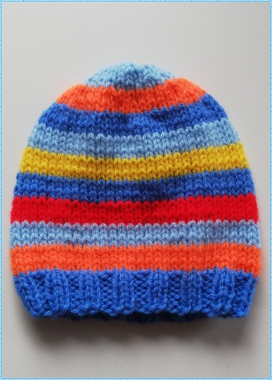 Du kannst diese Mütze wunderbar mit Resten stricken. Ich habe Rellana Caprice verwendet, in Orange, Dunkelblau, Hellblau, gelb und mehr.
