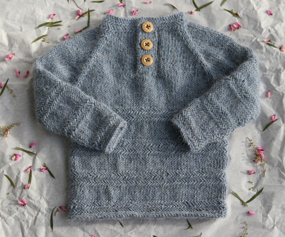 Der WASSERMANN-Pulli wird von oben nach unten und ohne Naht gestrickt. Nachdem der Kragen und die Knopfleiste gestrickt sind, werden die Arme vom Rumpf abgeteilt. Erst wird der Rumpf und danach werden die Arme in Runden gestrickt. Die Fischgräten-Stricktechnik wird als Designelement verwendet. Den Name WASSERMANN-Pulli habe ich aufgrund meines Liebings-Kinderbuch gewählt.