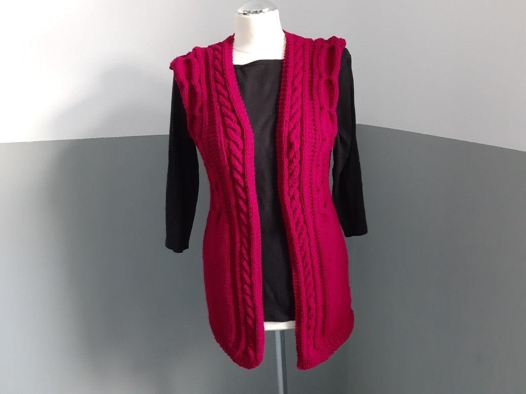 800 (950) 1100 g Woolly Hugs Charity (verwendet wurde Farbe 47 – Fuchsia) besteht aus 75 % Wolle, 15 % Polyamid und 10 % Polyactid, Lauflänge ca. 100 m auf 50 g, Stricknadel 4,5 bis 5,5