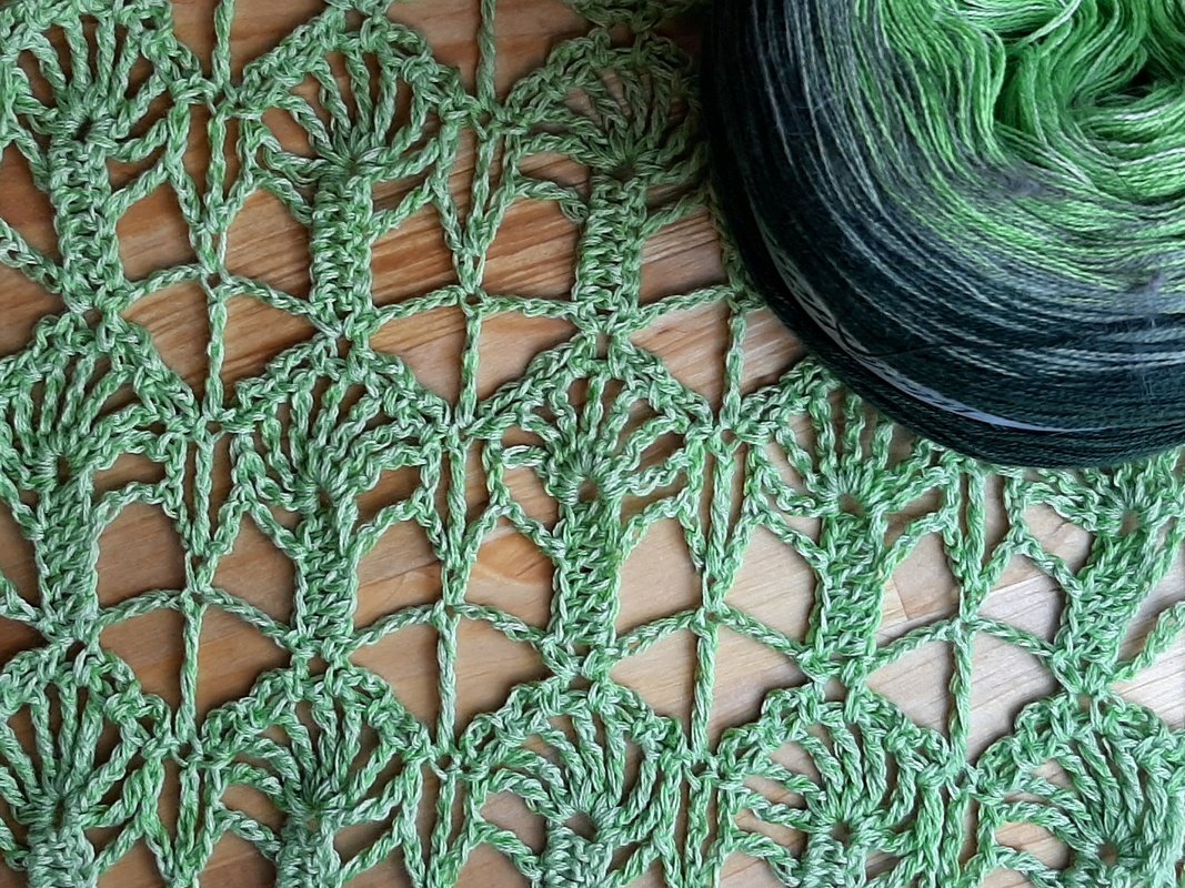 Ihr könnt aber auch anderes Garn verarbeiten. Es handelt sich um ein rechteckiges Tuch/Stola.