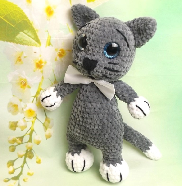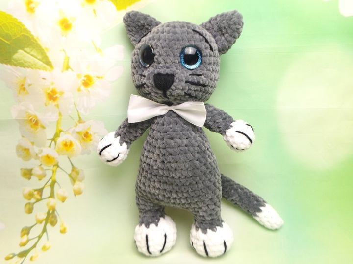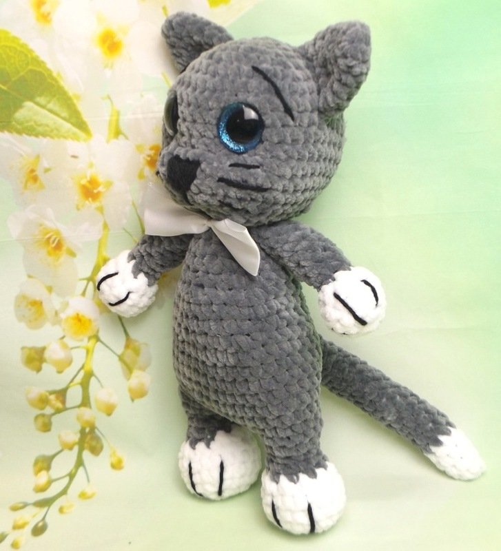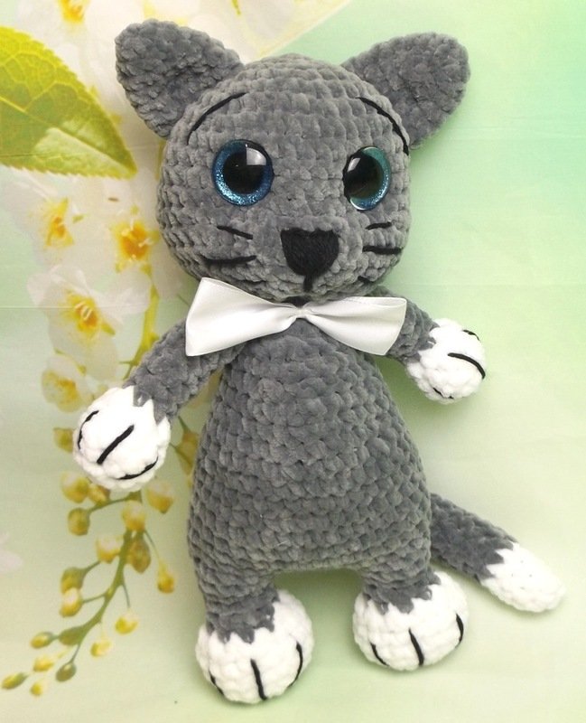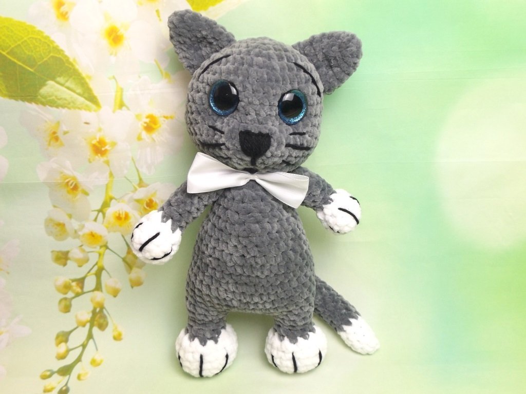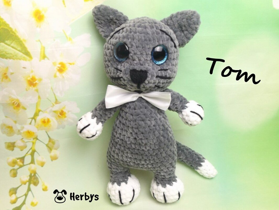 Dieser süße Kuschelkater ist aus Chenille Wolle gehäkelt und daher super flauschig und weich. Man muß ihn einfach lieb haben und mit ihm kuscheln. Kater Tom bringt garantiert das ganze Jahr viel Freude, ist eine süße Geschenksidee für jeden Anlass und begeistert sowohl Groß & Klein.