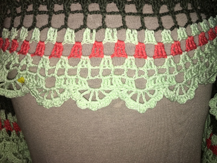 Ein Mustersatz, der sich in allen 3 Reihen wiederholt und durch die Farbkombination in Szene gesetzt wird. Eine verspielte Abschlußkante rundet das ganze ab.