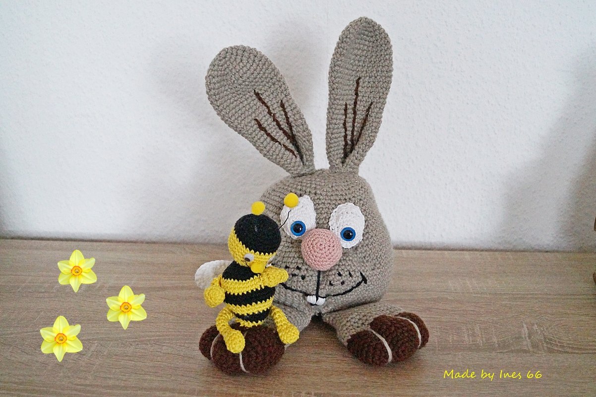 Hier erhaltet Ihr die bezaubernde Anleitung vom dicken Hasen Bertram und seinem Bienenfreund dem kleinen Holger, Holger läaat sich gern einmal am Fuß seines Freundes nieder und dann wird erzählt , man muss ganz leise sein,dann kann man sie hören :), ab und an schmollt Holger auch einmal, sein Gesichtsausdruck könnt ihr nach Lust und Laune varieren.