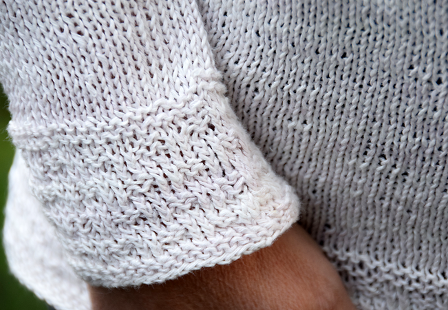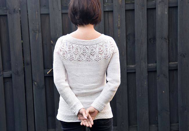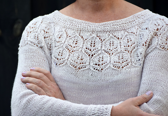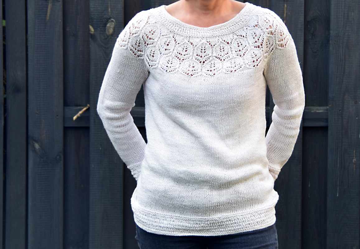 Der Sommer kann kommen! Dieser luftige Pullover ist einfach nachzustricken, man braucht lediglich Kenntnisse im Stricken von Lacemustern. Der Pullover wird von unten nach oben in einem Stück gestrickt. Zunächst strickt man Vorder- und Rückenteil in Runden bis zum Beginn der Passe, strickt dann die Ärmel und fügt schließlich alles zusammen, um die Passe zu stricken.