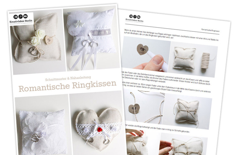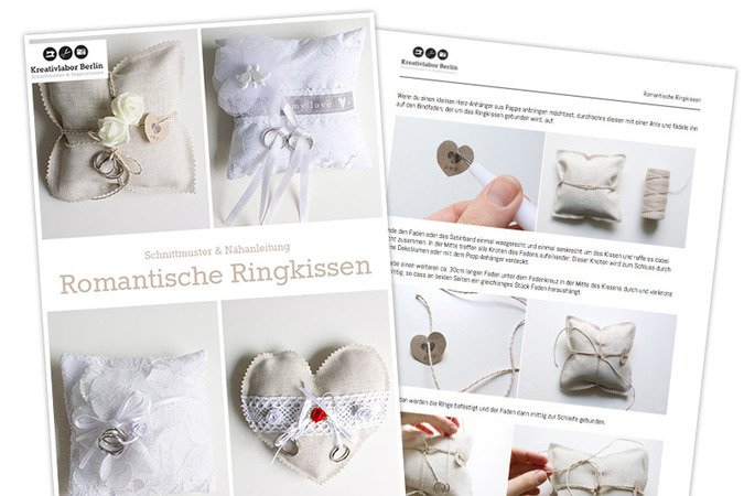 Im Ebook “Romantische Ringkissen” findet ihr verschiedene Schnittmuster und Nähanleitungen für vier bezaubernde Ringkissen. Sie können aus Baumwollstoffen, Leinen oder Spitze genäht werden. Webbänder mit Liebeszitaten, personalisierte Anhänger oder besonders edle Knöpfe machen euer Ringkissen zum Unikat. Viel Freude beim Nähen und natürlich beim Feiern!