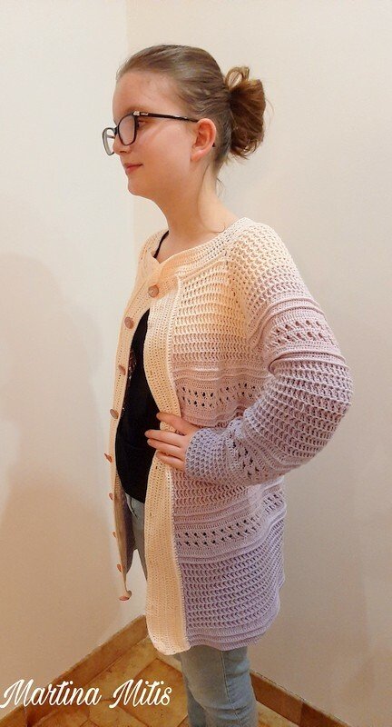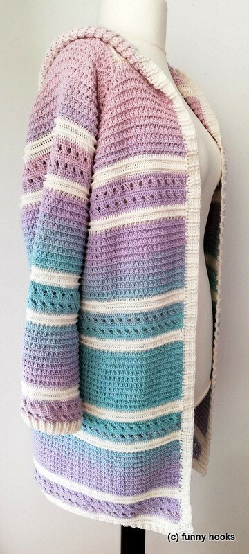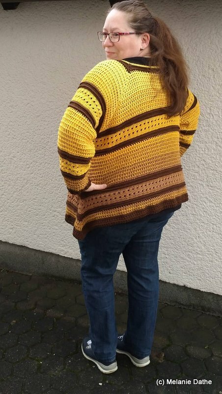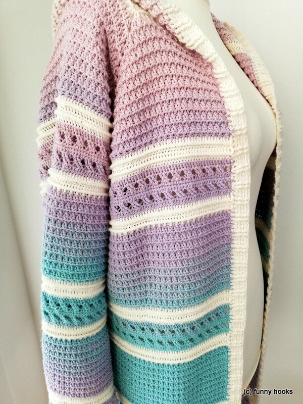 Die Jacke “Candy Stardust” wird in Raglan von oben gearbeitet (RVO). sie lässt sich auf alle Größen gut anpassen kann einfarbig, zweifarbig, kunterbunt, lang, kurz, mit kurzen oder langen Ärmeln gehäkelt werden.