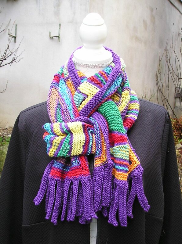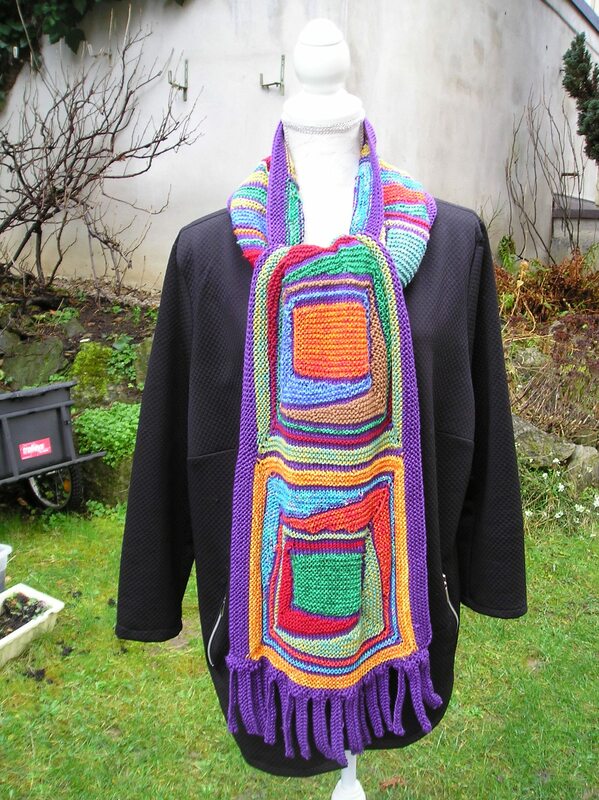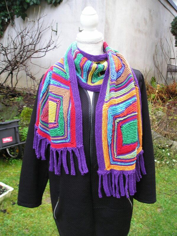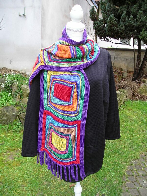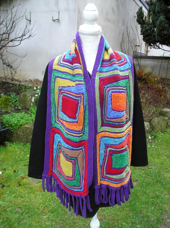 Für den Schal werden aus Garnresten sechs große Rechtecke gestrickt. Man beginnt mit einem kleinen Rechteck und strickt dann mit verkürzten Reihen rundherum um dieses kleine Rechteck. Danach werden die großen Rechtecke im Maschenstich zusammengenäht. Es folgt ein seitlicher Rand über die ganze Schallänge und Fransen an den Schalenden. Man sollte schon Strickerfahrung besitzen, wenn man diesen Schal stricken möchte.