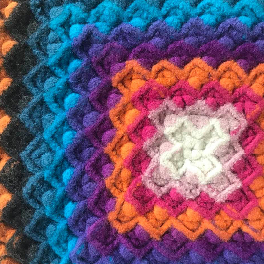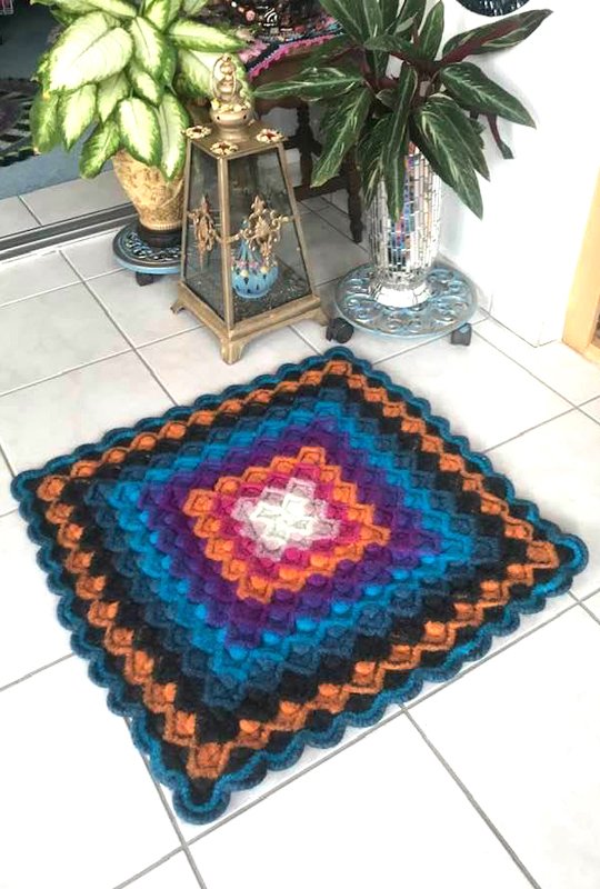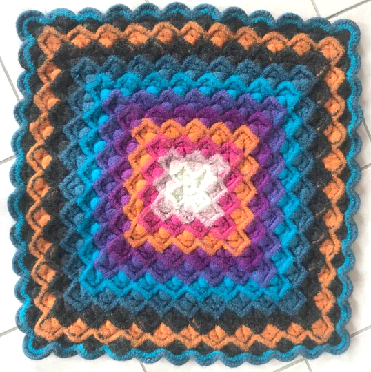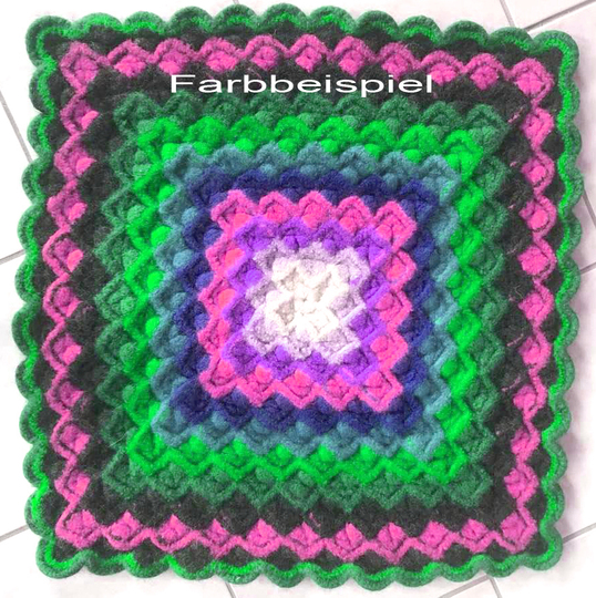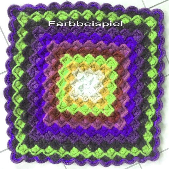 Mein fertiger Teppich wiegt 1000 gr und hat vor dem Waschen eine Seitenlänge von 86cm.... und nach dem Waschen ( und Schleudern) in der Waschmaschine bei 40° und mit 6 Tennisbällen nur noch 65cm Seitenlänge.....mit dem Muster ist er ist jetzt wunderbar verfilzt und wie ein richtig, dicker Teppich!