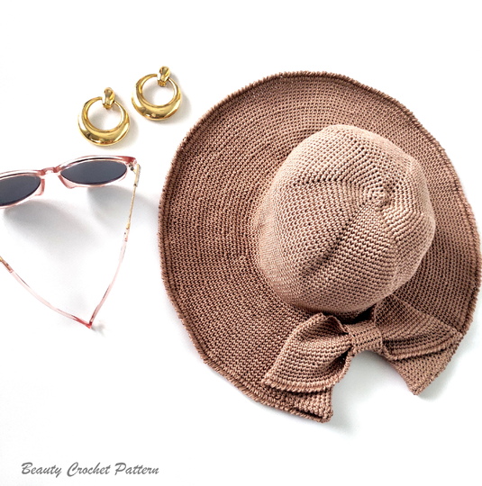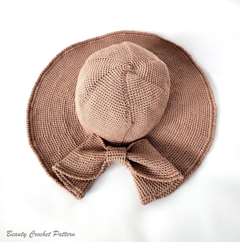 Dies ist eine Häkelmütze in einem Floppy-Design mit einer extra breiten Krempe und einer Schleife auf der Rückseite.
