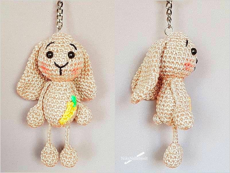 Hanne ist ein schnuffiges kleines Häschen, das dich am Schlüssel, einer Tasche, oder am Autospiegel begleiten kann. Zur Osterzeit ist sie eine zuckersüße Deko und als kleines Mitbringsel wird sie sicher viel Freude bereiten. Falls ein Häschen bei dir wohnt, kannst du die Farben deines Hasen individuell anpassen und schon wird er zu einem ganz besonderen Glücksbringer.