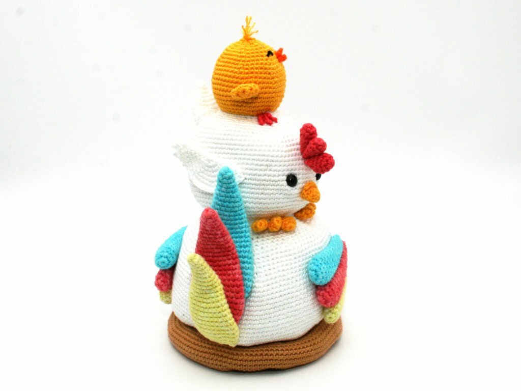 Nähfrei! Der Hühnerhaufen wird in einem Stück gehäkelt. Es müssen also zum Schluss keine Einzelteile aufeinander oder aneinander genäht werden.