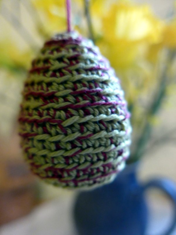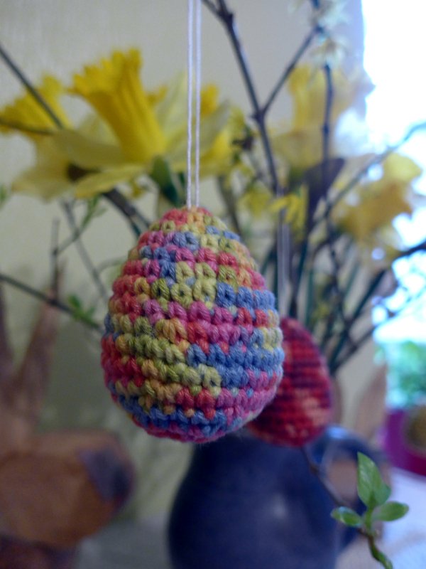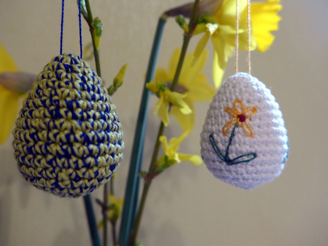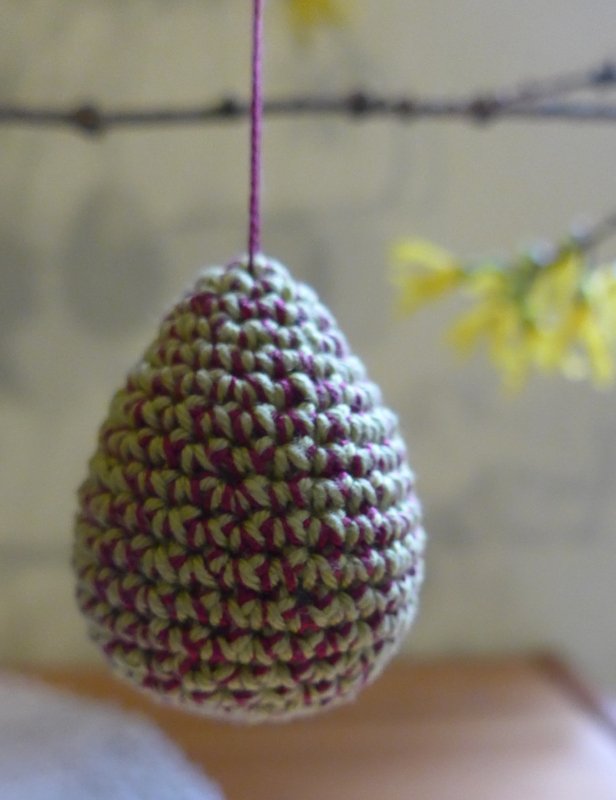Die fertigen Eier sind etwa zwischen drei und sehcs Zentimeter groß, je nach verwendetem Garn und Nadelstärke.