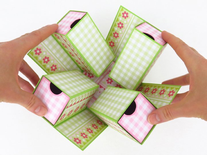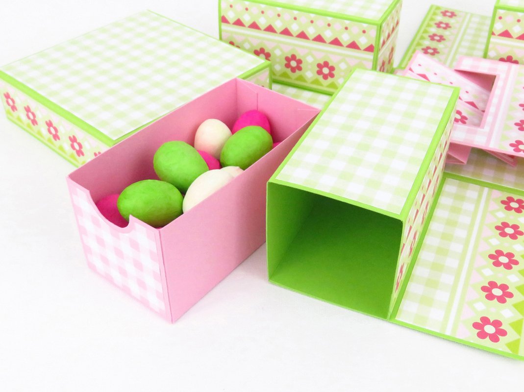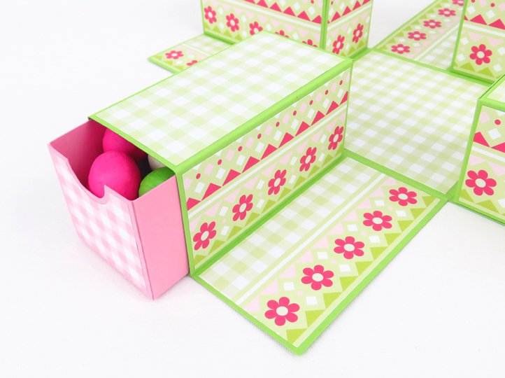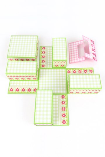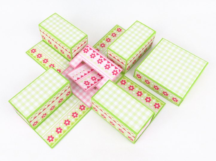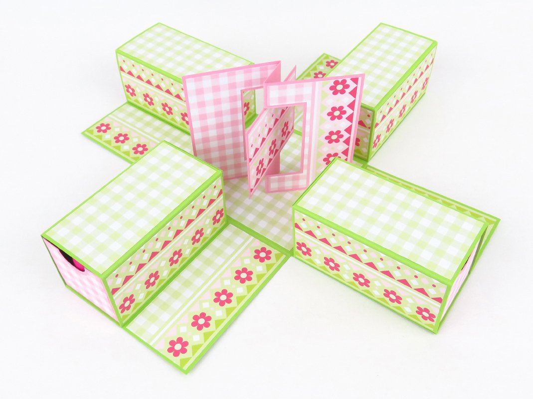 Wenn du im Frühling etwas kleines verschenken möchtest, dann gefällt dir vielleicht diese Explosionsbox als Geschenkidee: Sie beinhaltet vier Schubladenboxe, die du mit kleinen Dingen wie Bonbons, Pralinen, Glücksbringer, Schmuck und ähnlichem füllen kannst. Außerdem gibt es hier eine Grußkarte mit Aufklappmechanismus, die du passend zum Anlass beschriften kannst.