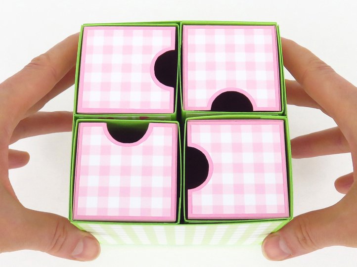 Die Box ist ca. 10 x 10 x 10 cm groß, die vier Schubladenboxen sind jeweils ca. 5 x 5 x 9,8 cm, die Karte – ca. 9,6 x 9,6 cm.