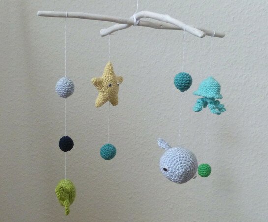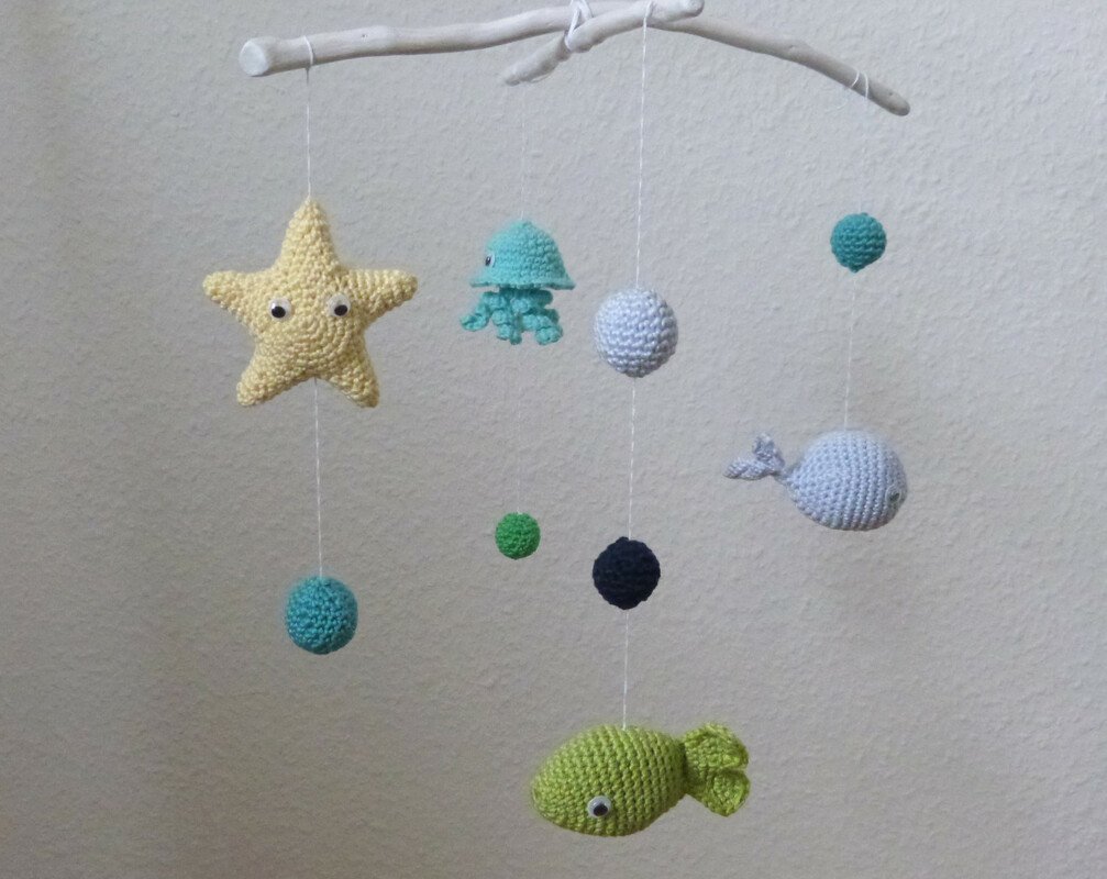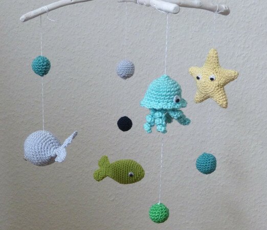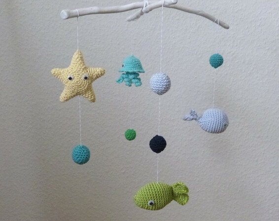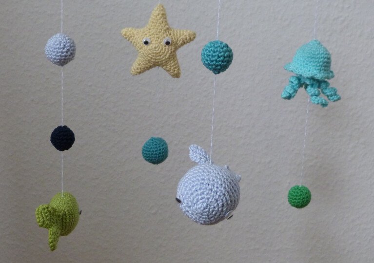 Die aufwändige 13-seitige Anleitung begleitet dich Schritt-für-Schritt bis zu einem tollen Mobile für dein Baby. Die Meerestiere Fisch, Seestern, Wal und Qualle sowie 2 verschieden große Blubberblasen werden detailliert beschrieben. Mehr als 60 Fotos helfen dir dabei, den Herstellungsprozess nachzuvollziehen. Die Anleitung beinhaltet keine Grundlagen sondern setzt Häkelkenntnisse voraus. Folgende Techniken werden verwendet: Luftmaschen, feste Maschen, Kettmaschen, Häkeln in Reihen und Runden, Zunahme und Abnahme von Maschen, nähen. Die Befestigung am Mobile-Kreuz wird nicht beschrieben.