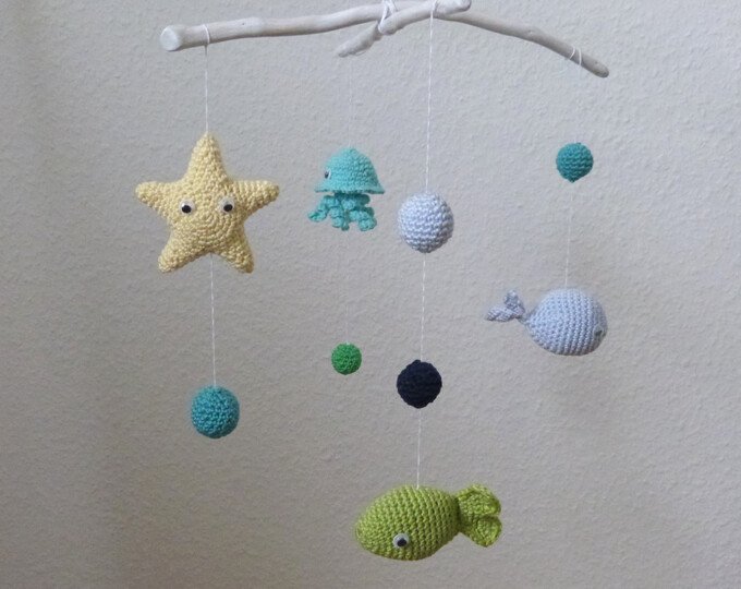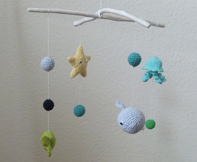 Hänge das Mobile über das Babybett oder den Wickeltisch und dein Baby wird interessiert die Unterwasserwelt beobachten. Es kann sich an den bunten Farben erfreuen, wird der Bewegung der Anhänger folgen und sich dabei entspannt wickeln lassen oder einschlafen. Dabei trainiert es ganz nebenbei spielerisch seine Sinne.