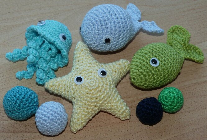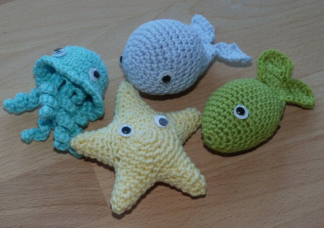Bei Verwendung von Baumwollgarn mit einer Lauflänge von 125m/50g und Nadelstärke 2,5 wird der Fisch etwa 8,5 cm lang, der Seestern wird 8 cm breit und die Blubberblasen bekommen einen Durchmesser von 2 und 3 cm.