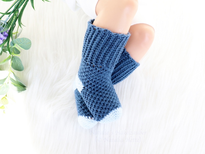 Diese PDF-Häkelanleitung besteht aus bebilderter Anleitung zum Häkeln von Baby- & Kindersocken "Denim" mit dem Muster im Stricklook für die Größen ab 0 Monaten bis zum 4-järiges Alter. Das Bündchen der Socken sieht ebenso wie gestrickt aus. Die Größe kann man auch für Erwachsenen umgerechnet werden. Die Socken können sowohl zwei- oder mehrfarbig oder einfarbig gehäkelt werden.