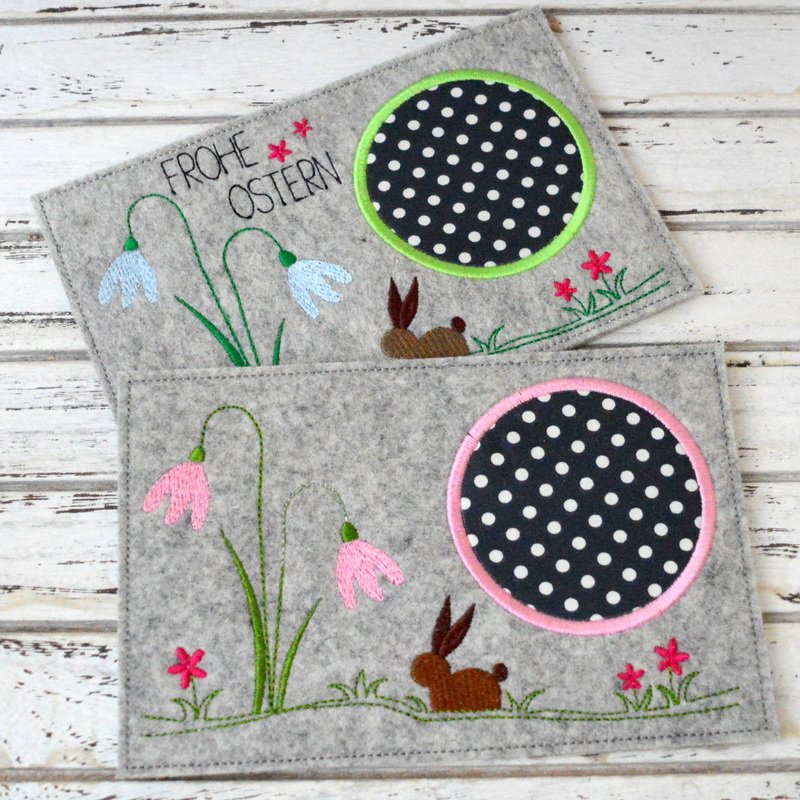 Untersetzer für eine Kaffeetasse, Kerzenglas, Blumenglas, süßer Tassenteppich mit einer Hasenwiese, kleines Geschenk, schnell gestickt, in der Größe 13x18cm und 13x20cm gespeichert, je 1x mit und 1x ohne "Frohe Ostern".