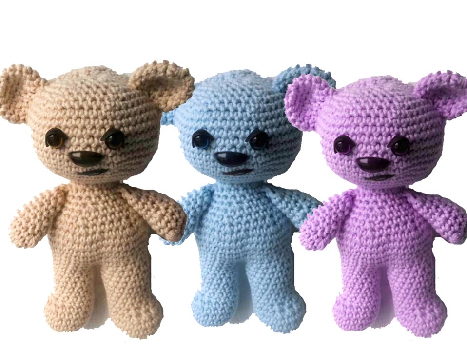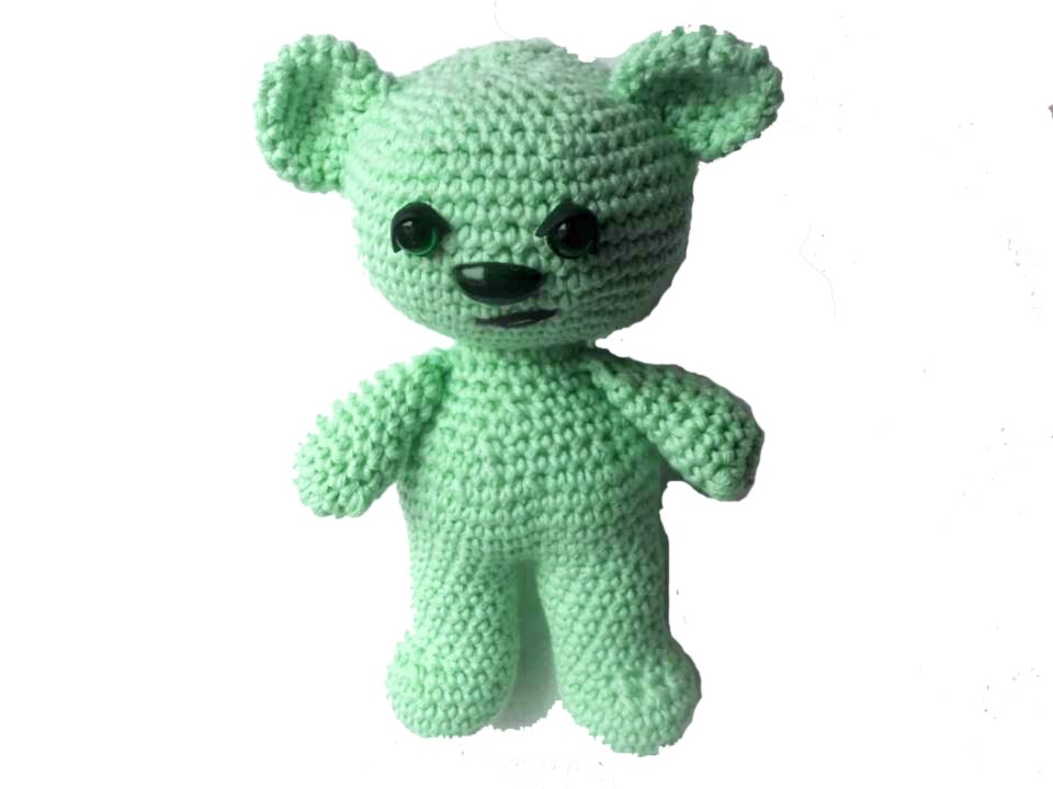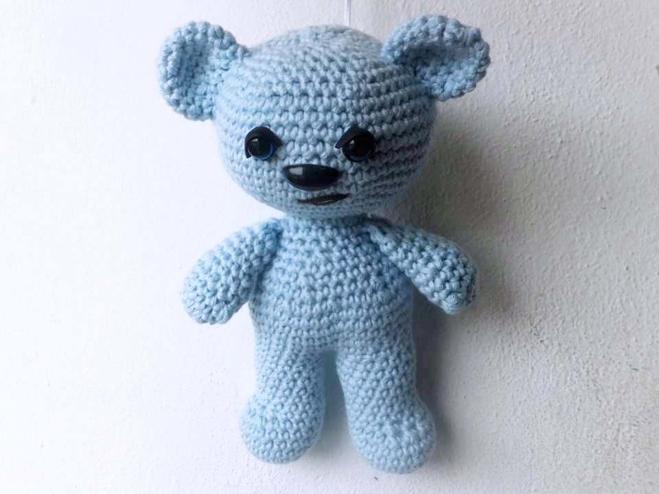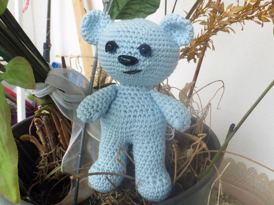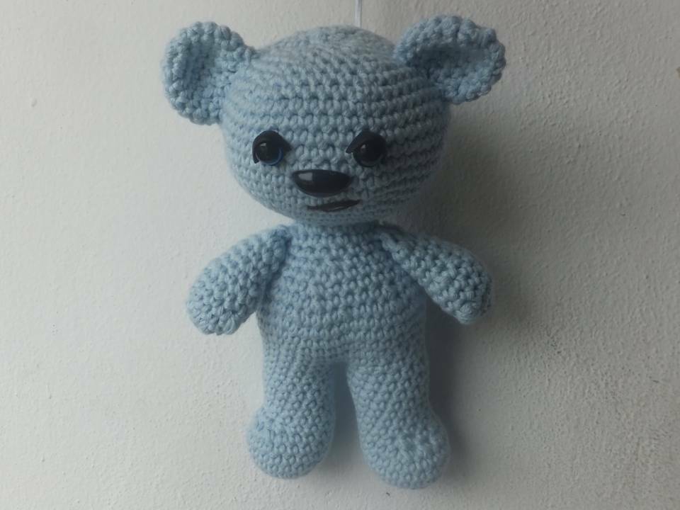 Dieser Bär wird etwa 15 cm groß. (Bei Verwendung gleicher Wolle, Abhängig auch von Deiner Häkelfestigkeit)