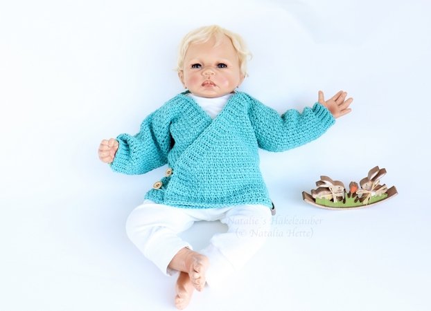 Vorteile einer Wickeljacke: 1. leicht anzuziehen; 2. hat nur zwei Nähte; 3. schnell und leicht zu häkeln; 4. kuschelig weich und angenehm für die Haut. Die Jacke kann sowohl für den Sommer, als auch für den Winter gehäkelt werden (abhängig von der Wolle).