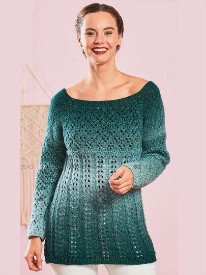 Diese Farbe und Muster passen hervoragend zusammen. Der Schnitt ist ganz einfach ein Raglan von oben, also ein Rvo. Somit kommt der Pulli ohne Nähte aus.