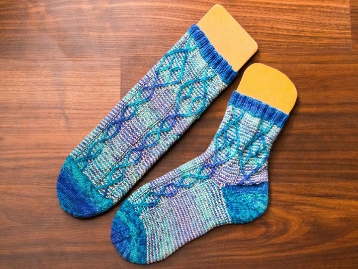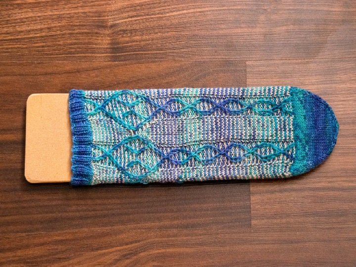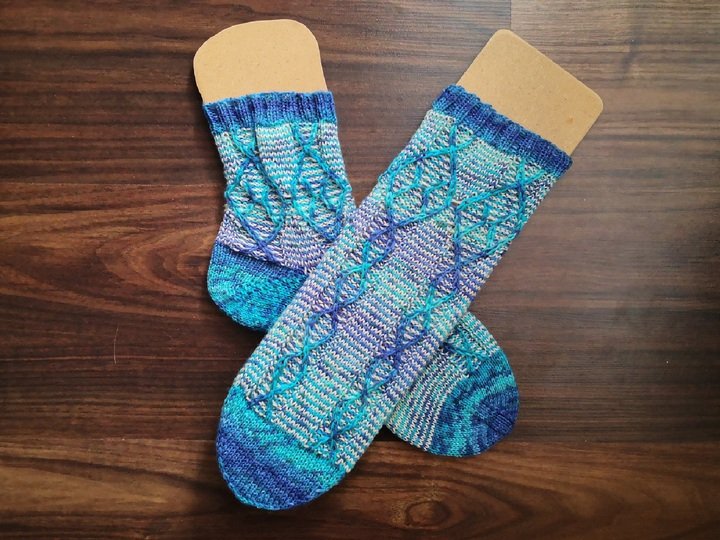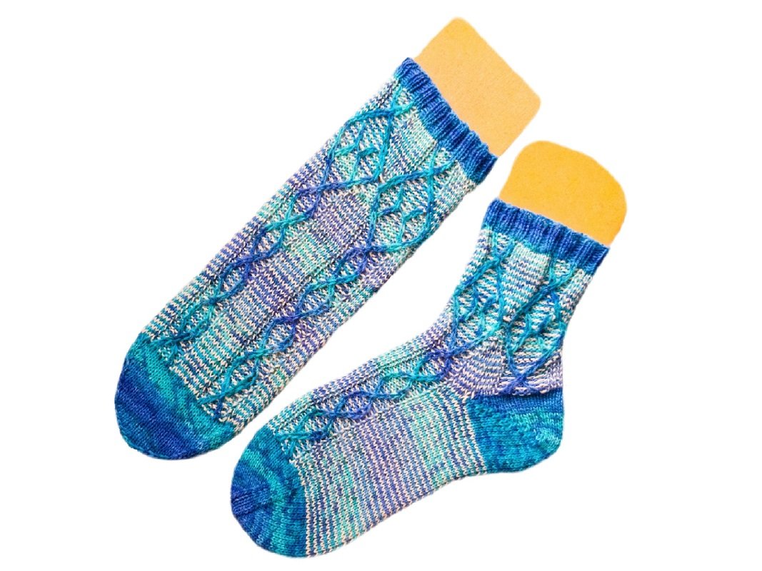Diese Socken werden mit der Hebemaschentechnik gestrickt, die sich erfahrungsgemäß immer ein wenig zusammenzieht. Es empfiehlt sich, mit einer halben Nadelstärke größer zu stricken, oder aber 4-8 Maschen mehr anzuschlagen, damit die Socken passen.