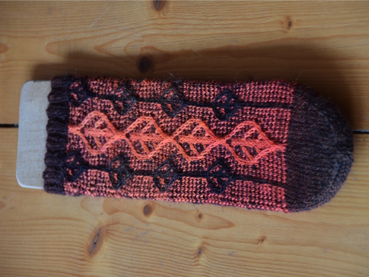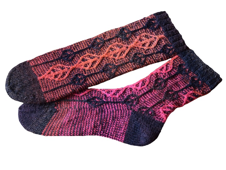 Diese Socken werden mit der Hebemaschentechnik gestrickt, die sich erfahrungsgemäß immer ein wenig zusammen zieht. Es empfiehlt sich, mit einer halben Nadelstärke größer zu stricken, oder aber 4-8 Maschen mehr anzuschlagen, damit die Socken passen.