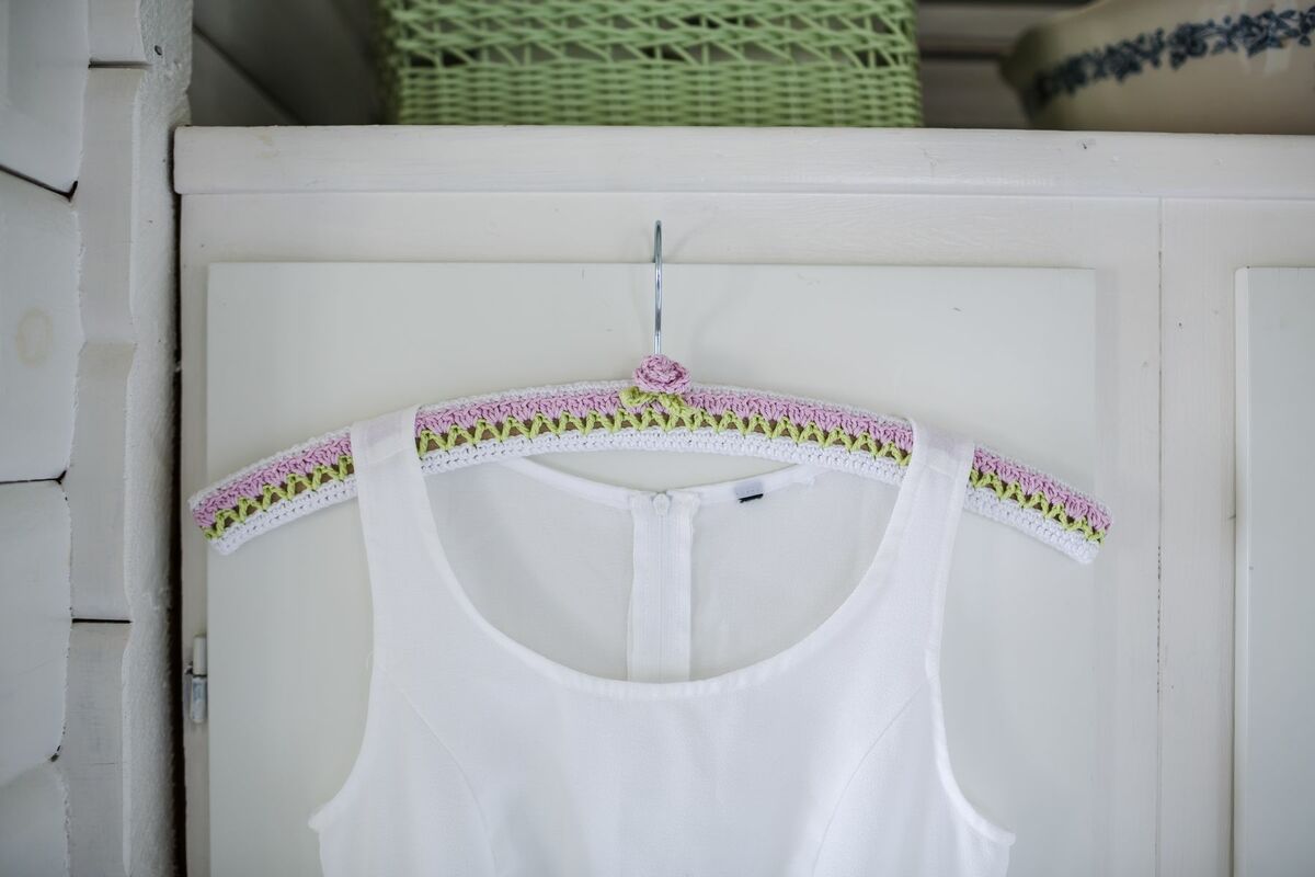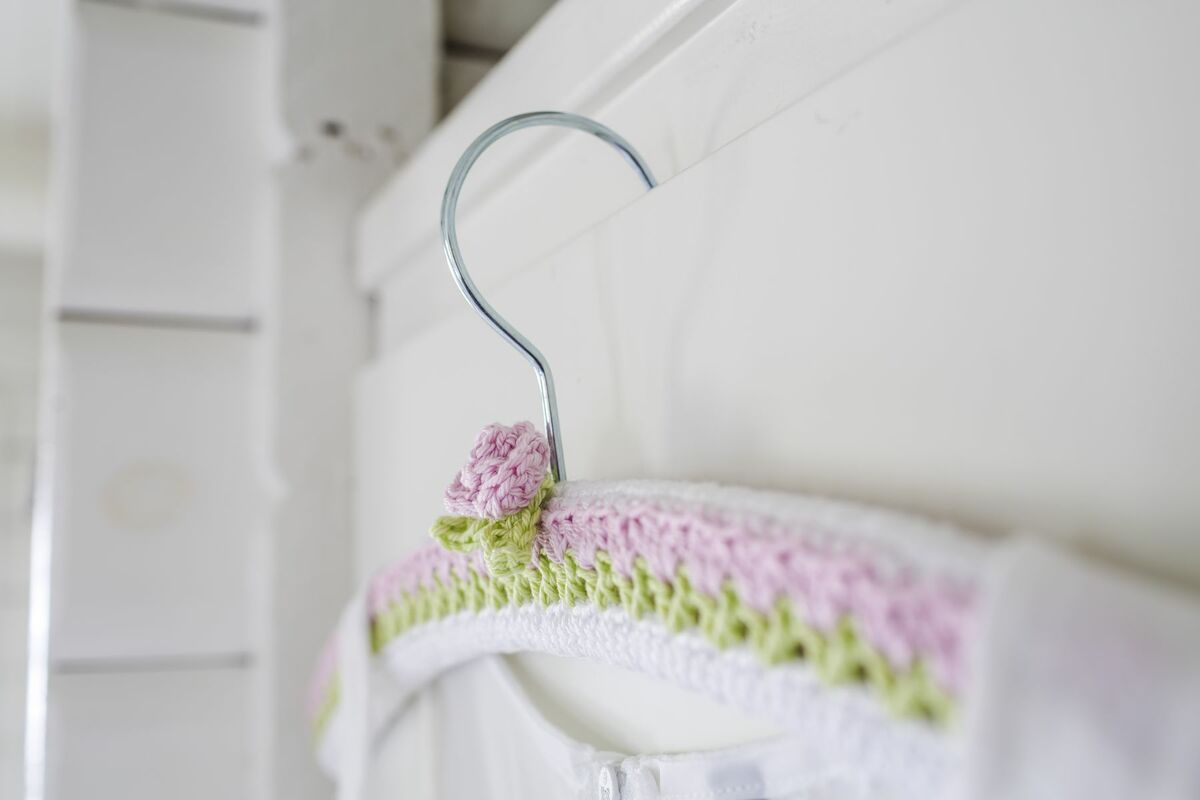 Häkelanleitung für einen wunderschönen Kleiderbügelbezug, gehäkelt aus festen Maschen, halben Stäbchen und Stäbchen.