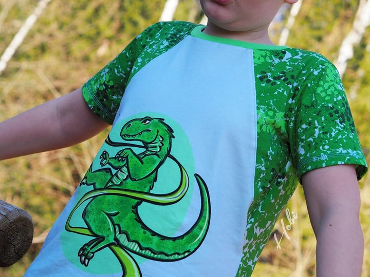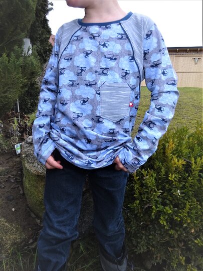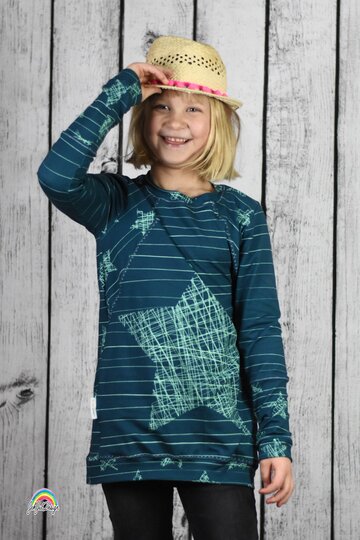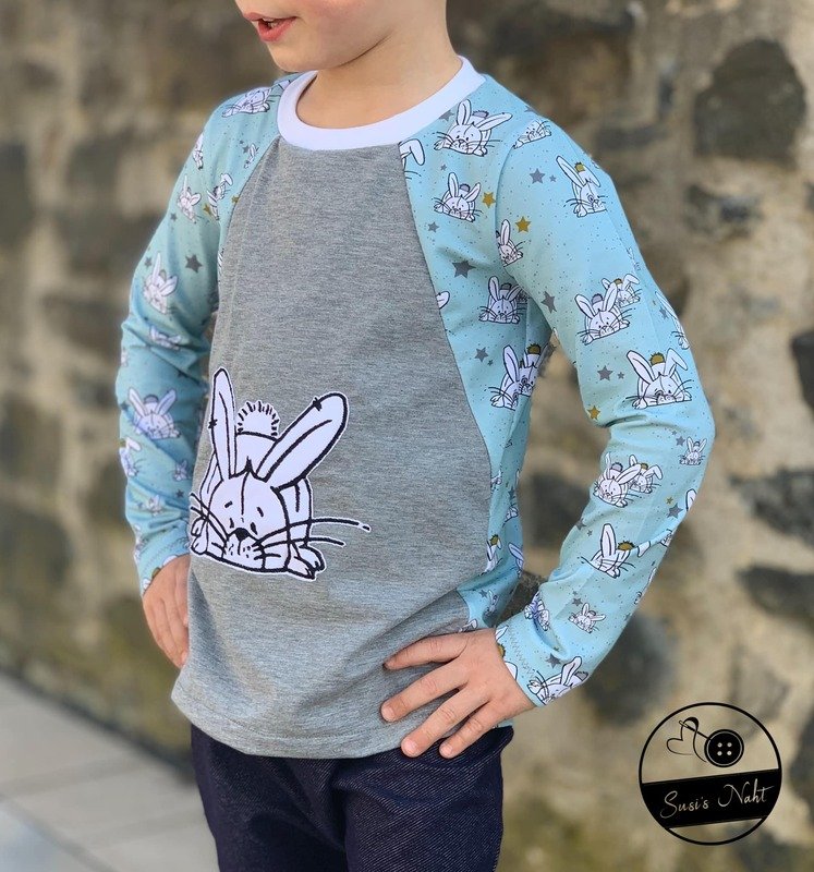Nähbar von Gr. 98 - 152 (Hauptteile jeweils in Doppelgrößen, die Ärmel in Einzelgrößen) kannst du das Shirt idealerweise aus Jersey fertigen. Auch sehr gut dehnbarer Sommersweat ist denkbar.