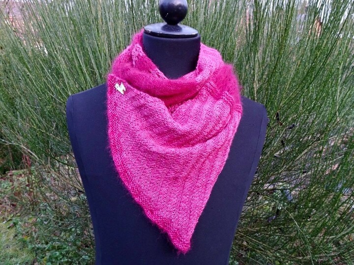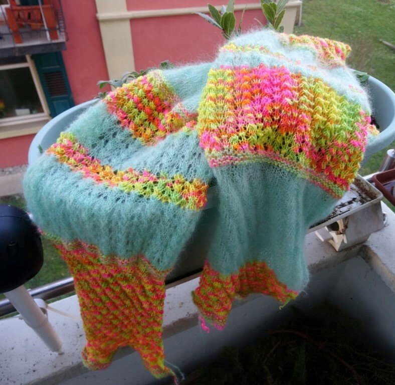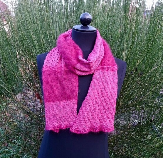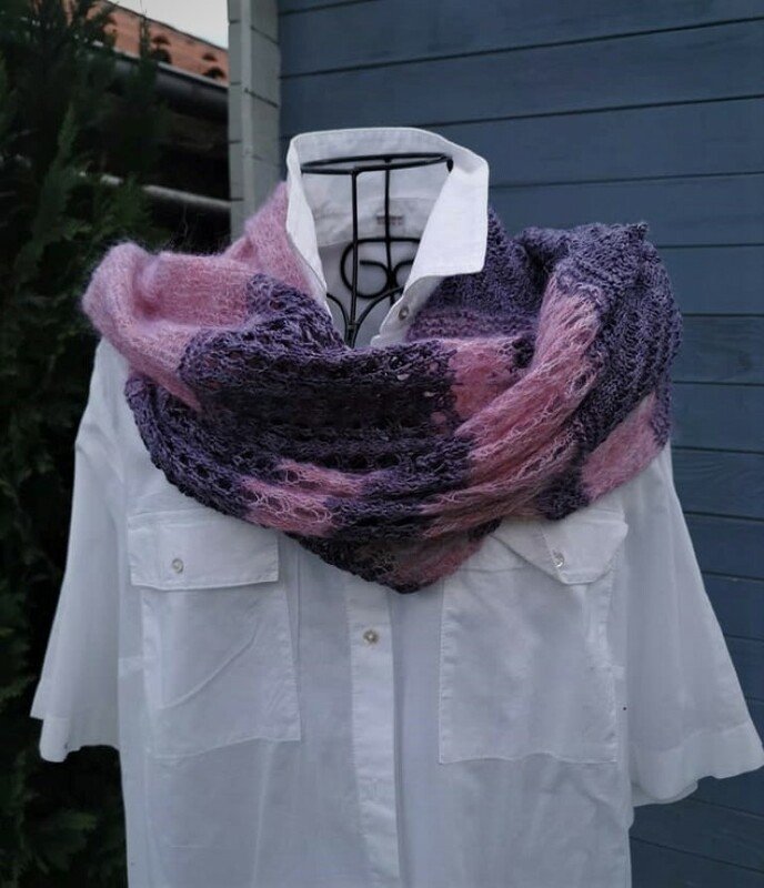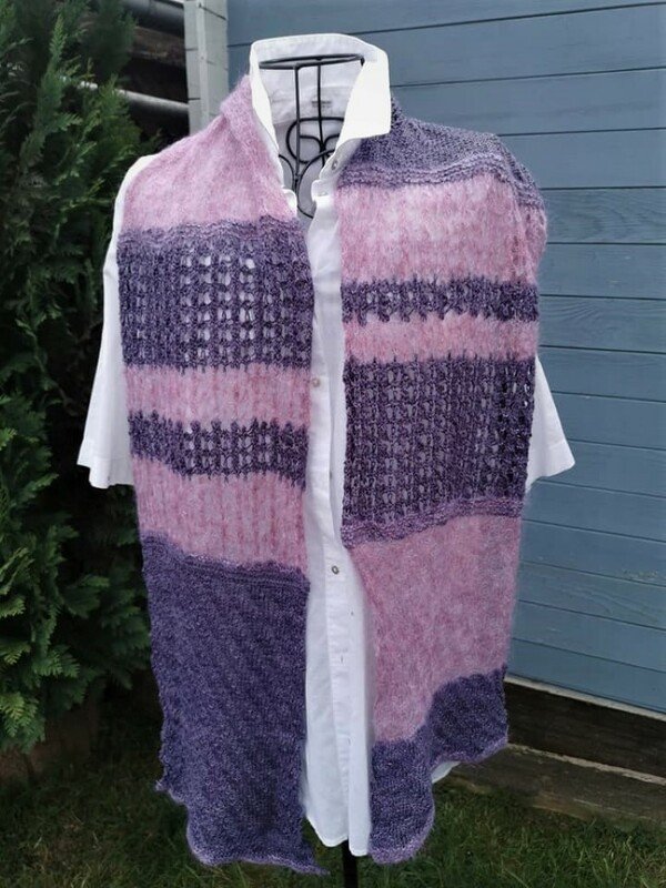 Es wurde ein superleichter Sommerschal daraus, der auch als Loop tragbar ist. Die beiden so unterschiedlichen Garne habe ich bewusst in loser Streifenfolge miteinander verbunden durch ein einfaches re-li Muster und ein einfaches Lacemuster.
