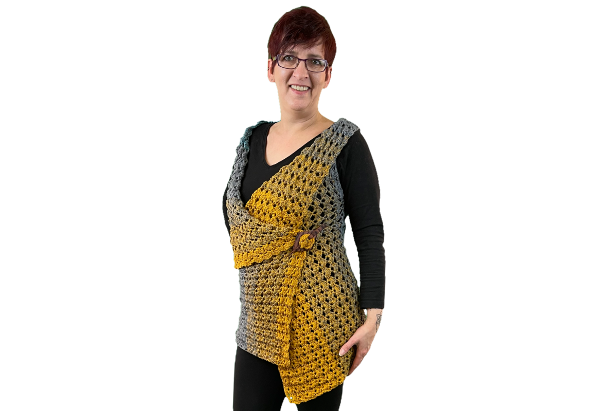 Für die Jacke / Weste habe ich Bobbel "Sahara" von MT.Bobbelwelt verwendet. 1600LL 6Fädig und mit NS 5,5mm Größe 36/38