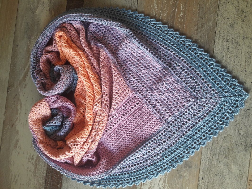 „Anders“ ist ein symmetrisches Dreieckstuch, das mit mehreren Richtungswechseln gehäkelt wird. Die verschiedenen Teile haben nicht nur unterschiedliche Richtungen, sondern auch jeder ein anderes Strukturmuster. Eine Bordüre wiederholt sich in jedem Abschnitt und trennt gleichzeitig die einzelnen Teile optisch. Durch die unterschiedlichen Muster wird es nie langweilig.