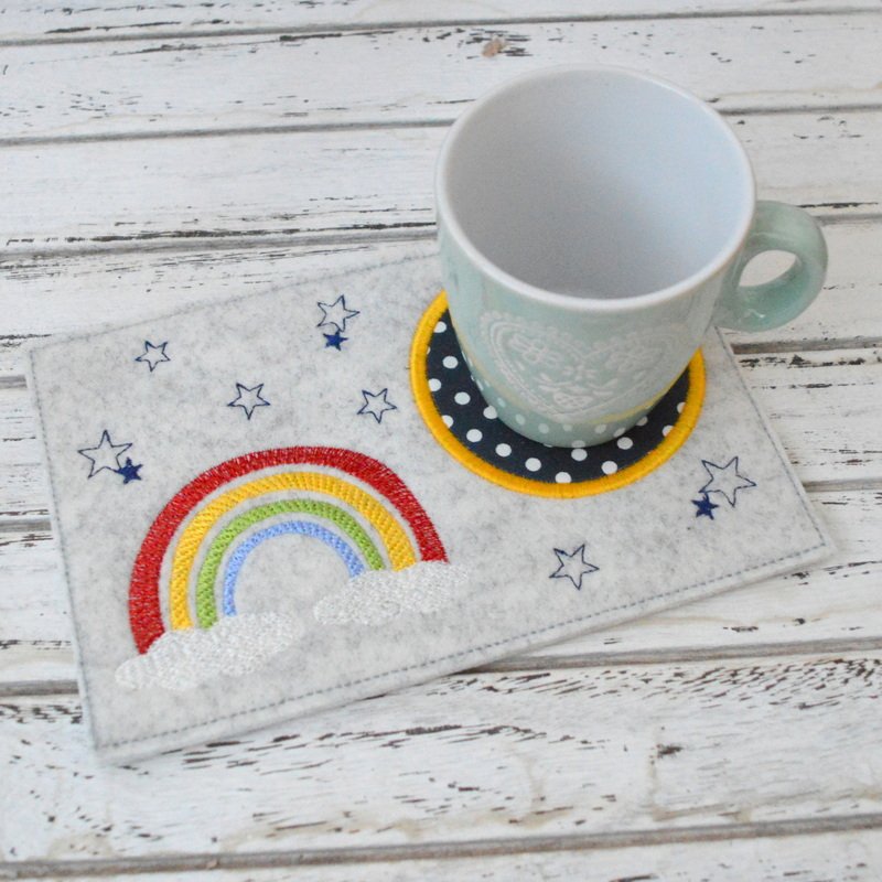 Untersetzer für eine Kaffeetasse oder Kerzenglas, süßer Tassenteppich mit einem Regenbogen, kleines Geschenk, schnell gestickt, in der Größe 13x18cm und 13x20cm gespeichert.