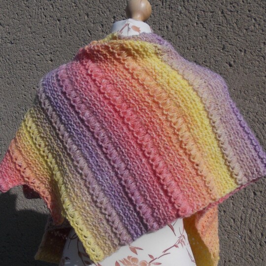 Mein Tuch ist ca. 185 cm breit und ca. 55 cm tief. Wenn Du anderes Garn verwendest, sollte es kein Problem sein, die Anleitung anzupassen. Die Muster wechseln sich stetig ab.