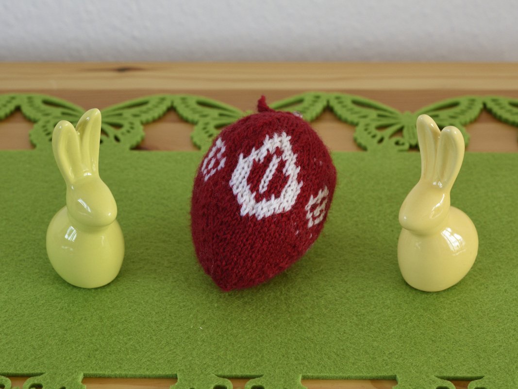 Ostern naht! Wie wäre es mit einem gestrickten Osterei als Deko? Dieses hübsche rot-weiße Bordüren-Ei ist schnell gestrickt und Eure Wollreste finden endlich eine sinnvolle Verwendung. In dieser Variante ist das Ei fest in der Hülle eingestrickt und kann nicht mehr entfernt werden. Als Füllung eignen sich also nur Kunststoffeier aus Acryl in der Größe 8 cm.
