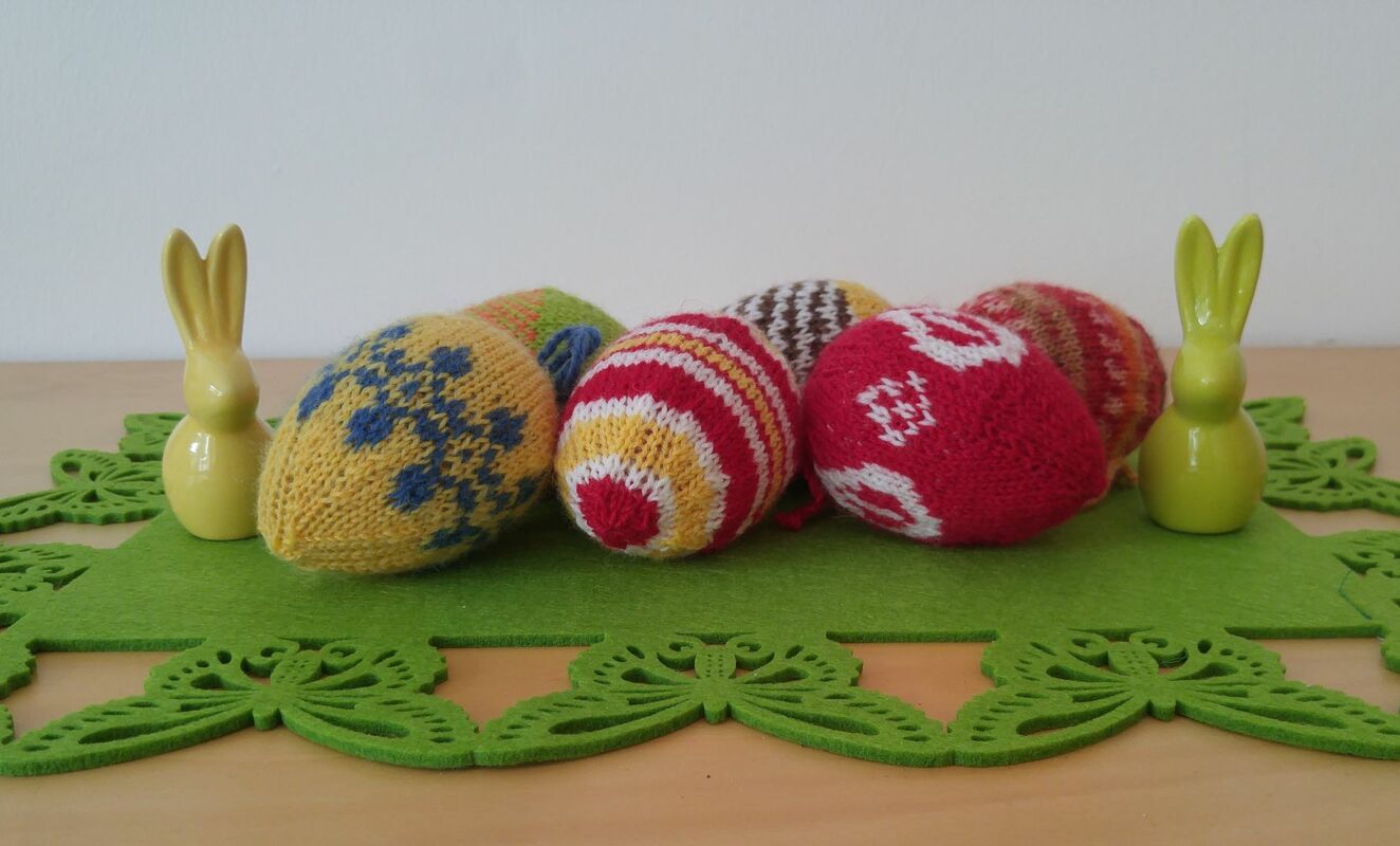 Ostern naht! Mit diesem Sparset kaufst Du die Anleitungen für die sechs im Bild gezeigten gestrickten Ostereier für Eier in der Größe von ca. 8 cm.