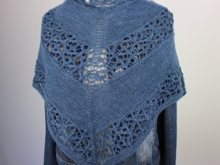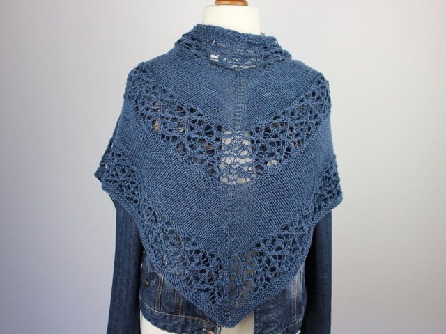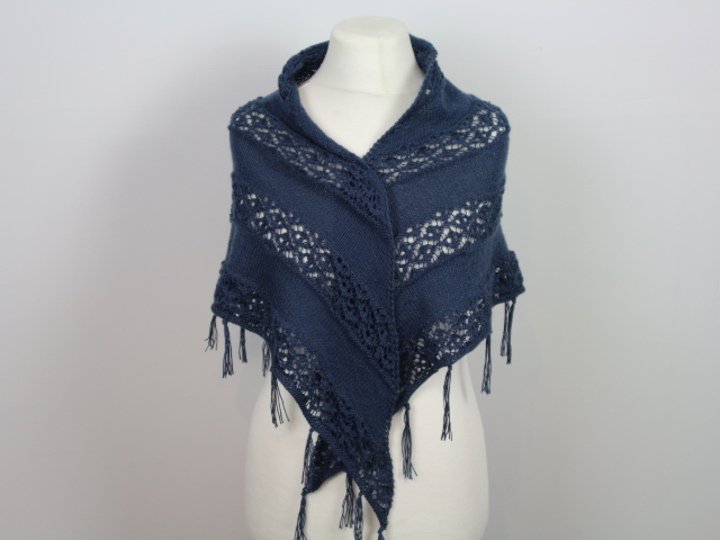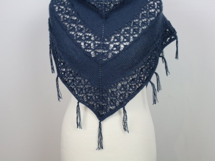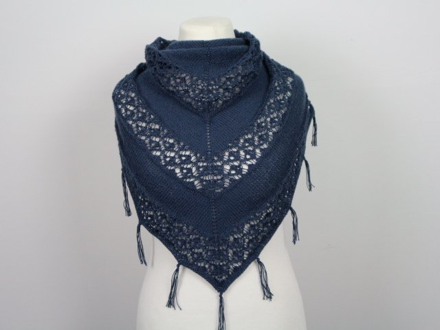 Maschenprobe: 22 Maschen und 36 Reihen = 10x10 cm, in glatt rechts, nach dem Spannen. Die Maschenprobe ist nicht wichtig bei diesem Projekt. Eine andere Maschenprobe kann allerdings ein größeres oder ein kleineres Tuch ergeben und der Garnverbrauch ändert sich.