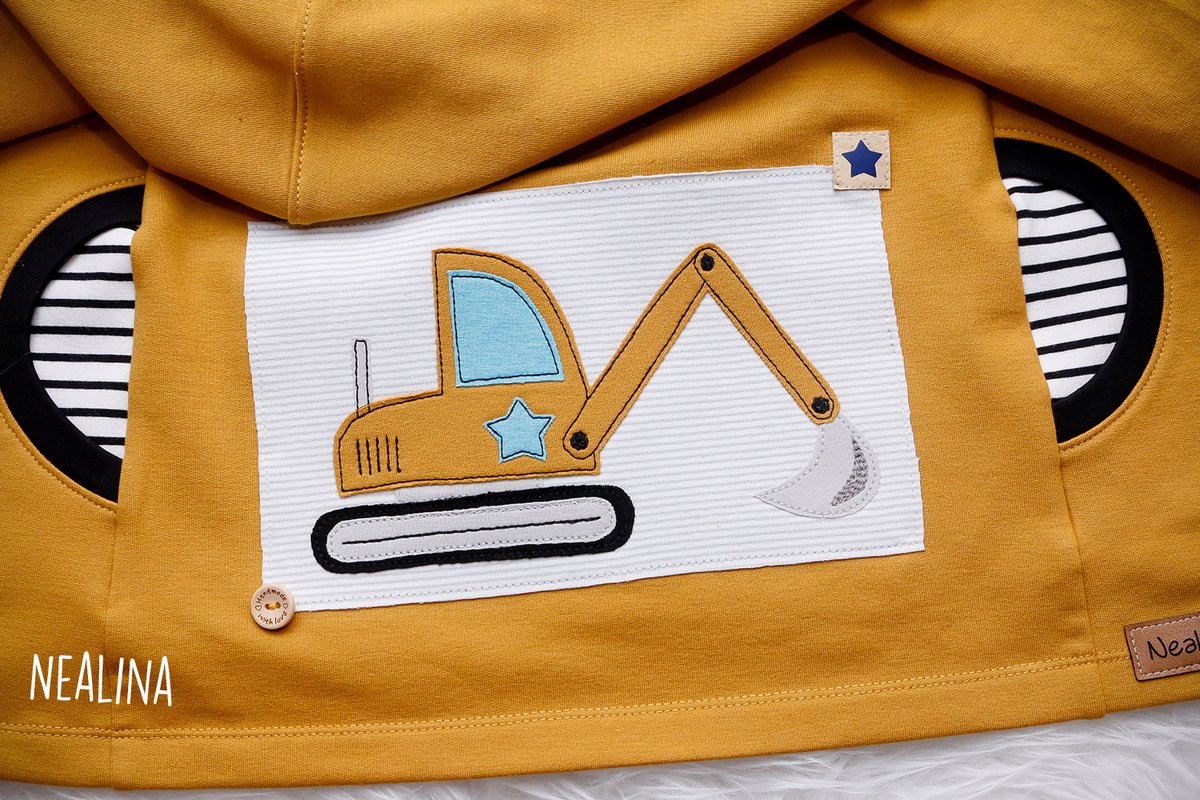 Für alle Bagger-Fans! Die Vorlage enthält eine Anleitung, die normale und gespiegelte Variante und daneben auch ein Ausmalbild. Die Appli ist auch für Applizieranfänger geeignet.