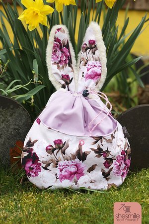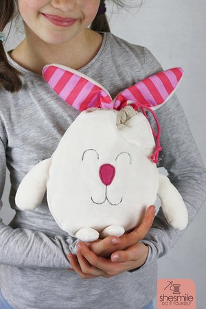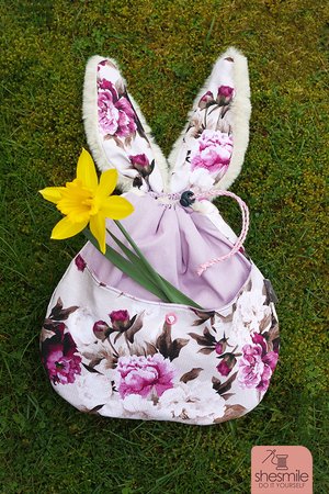 Nähanleitung und Schnittmuster gestaltet als PDF-E-Book für eine Wendetasche mit Kordelzug welche nach dem Wenden zum süßen Hasenkuscheltier wird. Der Osternesthase!