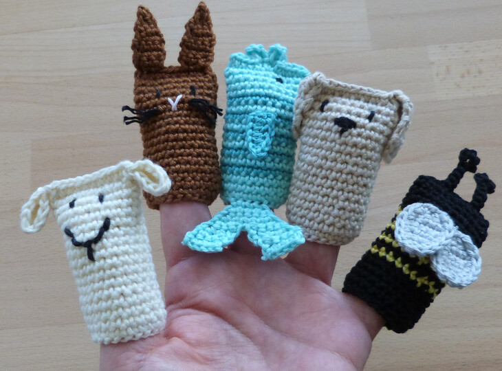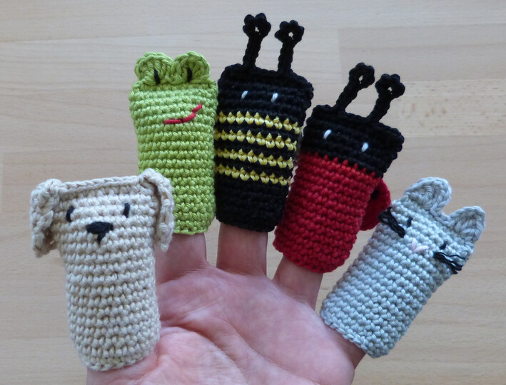 Die Anleitung zeigt dir, wie du ganz leicht die putzigen Modelle Hund, Katze, Hase, Frosch, Schwein, Panda, Biene, Schaf, Fisch und Marienkäfer häkeln kannst. Damit die Fingerpuppen auch auf kleine Finger passen, ist eine Anleitung für einen "Adapter" dabei.