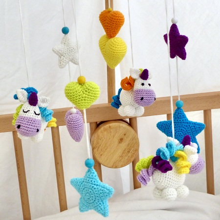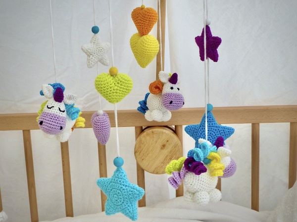 Das süße Mobile im Design der Mathilde Einhorn ergänzt die schon vorhandenen Anleitungen für eine Spieluhr, sowie den Greifling und das Knistertuch und ist ein individuelles Geschenk zur Geburt.